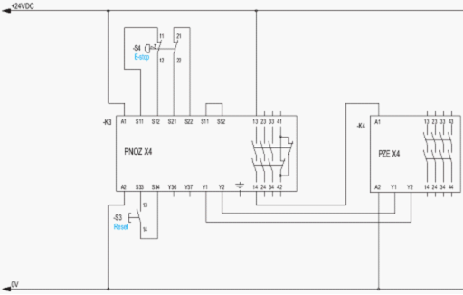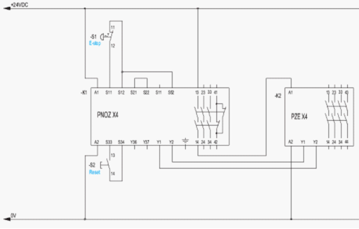 若是使用單通道信號(hào)輸入,進(jìn)入安全繼電器,那么這個(gè)控制電路的安全等級(jí)是在2級(jí),如圖4所示。