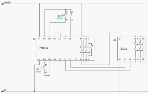 若使用雙通道信號(hào)輸入,進(jìn)入安全繼電器,同時(shí)可檢測(cè)兩個(gè)輸入觸點(diǎn)間的短路。那么這個(gè)控制回路的安全等級(jí)是在4級(jí),如圖6所示。